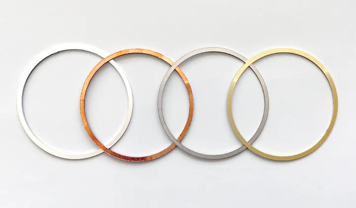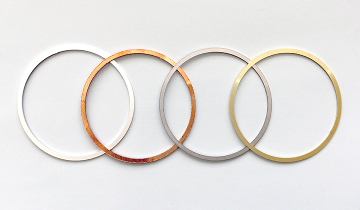 画像のようなベアリングの内輪・外輪に合わせたリング型シムのような、素材違いで同形状の加工実績があります。